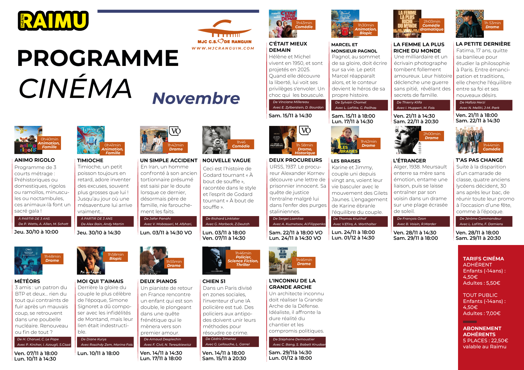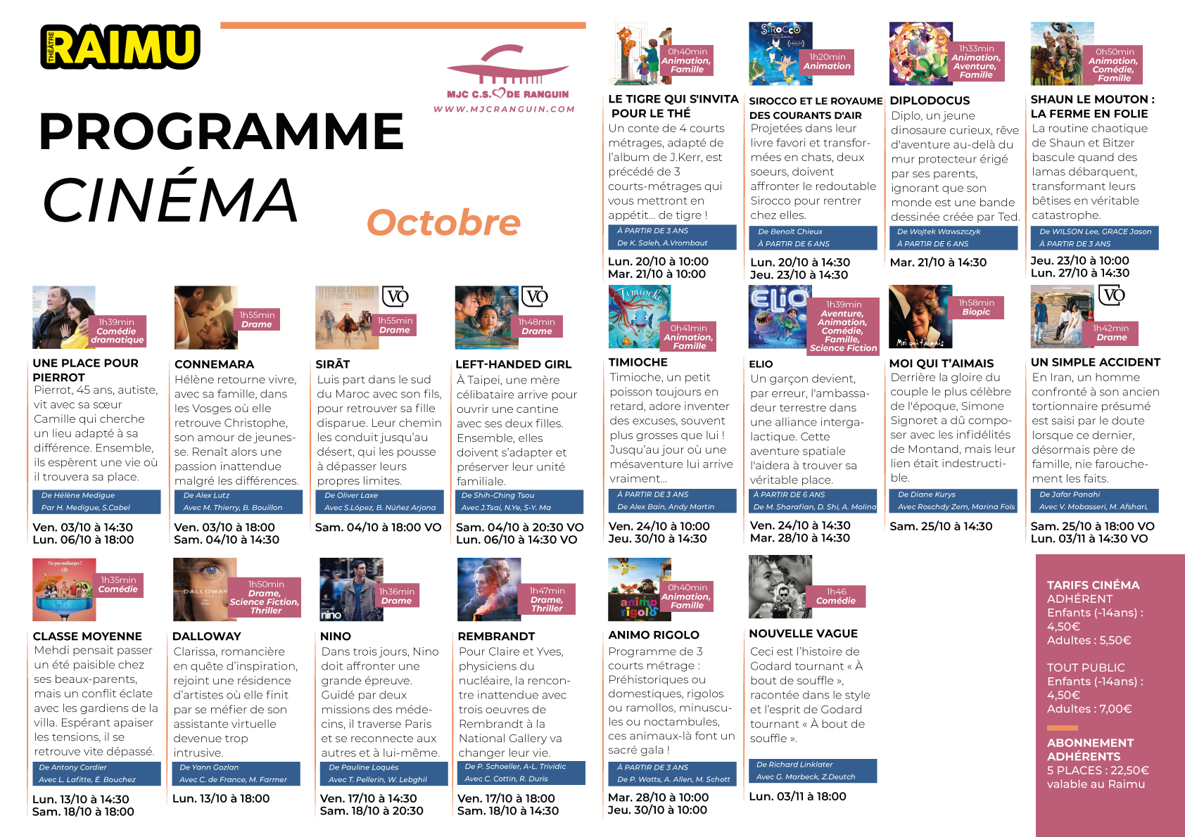 Les lundis, mercredis, vendredis et samedis, le Raimu vous propose une programmation actuelle de films grand public, d’animations pour le Jeune Public. Le Raimu est également un Cinéma Art & Essai, où vous pouvez découvrir également des films d’auteur, des films étrangers en version originale. Retrouvez le programme à l’accueil du Raimu, la MJC, auprès de nos partenaires et sur le site www.allocine.fr